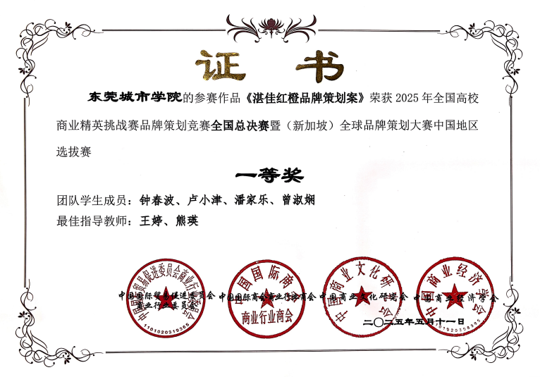 本次大赛汇聚全国700余所高校、超10000支队伍参赛。其中不乏985、211学校、双一流学校,所有队伍不分赛道、同台竞技。在如此激烈的竞争中,由王婷老师、熊瑛老师指导的“湛佳红橙品牌策划案”团队,贾瑶老师、王婧宇老师指导的“Purr噗噜品牌策划书”团队脱颖而出,摘得全国一等奖;李琳老师、王世谦老师指导的“道滘佳佳美品牌策划书”团队荣获全国二等奖。