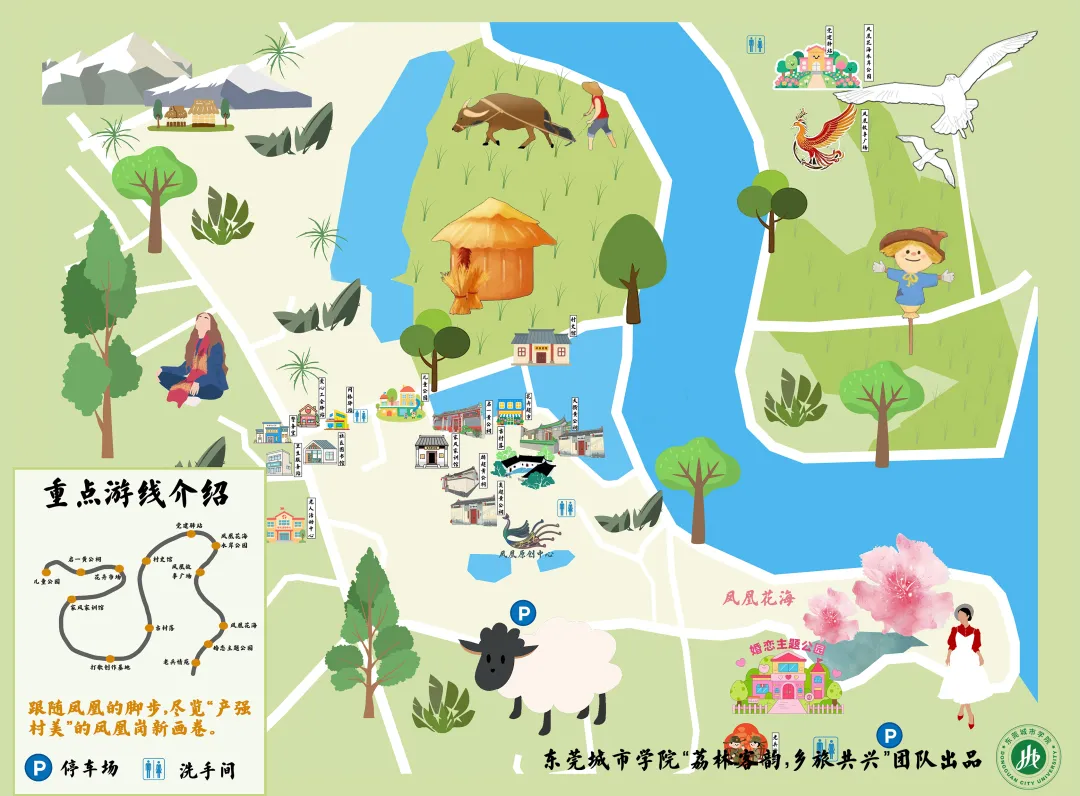 此次调研是beat365官方网站“三下乡”活动开展的延伸和深化。今年暑期,该校城建与智造学院人文地理与城乡规划专业与凤凰岗村结对,组建“荔林客韵·乡旅共兴”团队,开展“百千万工程”突击队行动。他们利用专业知识,结合当地需求,制作了一套完整的旅游地图和视觉标识系统。团队还结合凤凰岗的“荔林”生态资源与“客韵”文化底蕴,设计了具有当地特色的文创IP。