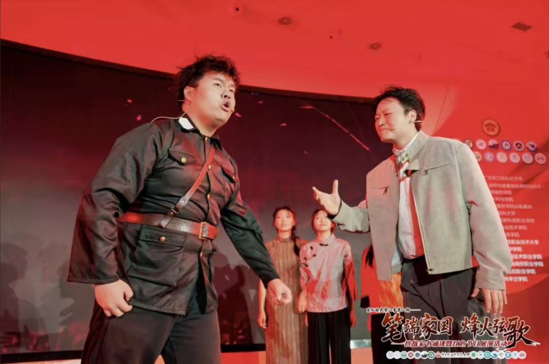 展演伊始,22级音乐表演专业音乐剧实验创新班的同学们率先登场,带来音乐剧《国之当歌》选段《醒来吧,雄狮!》。作为学校“红舞台”重点孵化节目与声乐一流课程“音乐剧表演与演唱”模块的核心实践成果,同学们在舞台上身着贴合时代背景的服装,将课程中习得的扎实唱腔功底、精准情感表达与“红舞台”常态化展演中锤炼的舞台张力深度融合,生动再现了抗战时期中华儿女冲破阴霾、奋起抗争的壮阔图景。激昂的旋律搭配极具感染力的表演,瞬间点燃现场气氛,让观众仿佛置身于那个救亡图存的燃情岁月,赢得阵阵雷鸣般的掌声。这一节目既体现了声乐一流课程对专业技能的系统培养,更彰显了“红舞台”以红色作品为载体的思政育人导向,实现了艺术素养与家国情怀的同步提升。