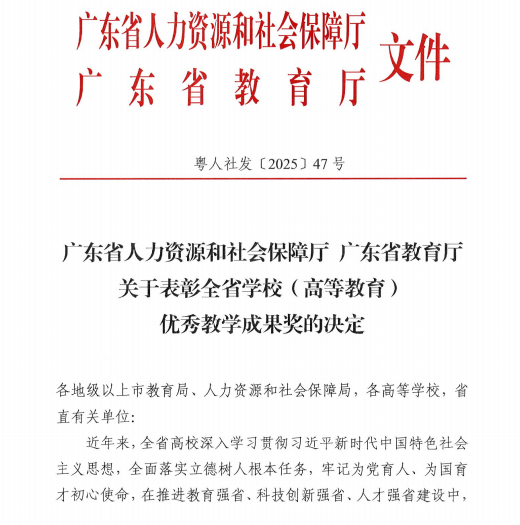 近日,广东省教育厅与省人力资源和社会保障厅联合发布《关于表彰全省学校(高等教育)优秀教学成果奖的决定》。beat365官网在此次评选中表现突出,荣获一等奖1项、二等奖2项,获奖数量与质量均创历史新高,实现了标志性的“双突破”。
