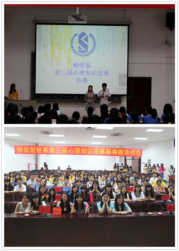5月15日,财经系在7B201举行第三届心理知识竞赛决赛。经过初赛笔试的筛选,共有六个队伍进入决赛。本次比赛设有必答环节、抢答环节、互动环节、风险环节、情景模拟问答环节、心有灵犀环节以及人气得分环节。
