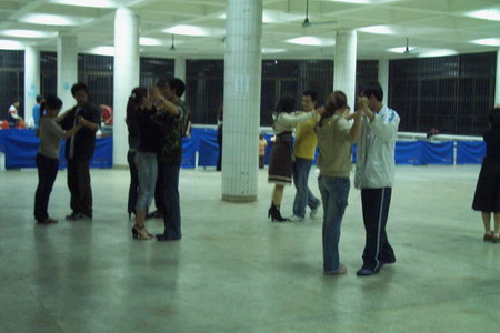 当音乐响起,一些“舞”林高手早已欢快的起舞,而另一些舞技稍差或还没学过舞蹈的人则在老师的带领下,认真的练习基本功。虽然有些跳得并不是很好看,甚至显得笨拙,但跳舞者却完全乐在其中,而一边看热闹的师生也是大饱眼福,一副跃跃欲试的样子。于是,舞场的人越来越多,有朝气蓬勃的学生,有舞步成熟优雅的年轻教师,也有头发灰白的教师夫妇。