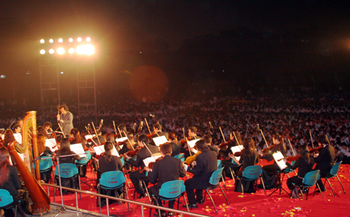 4月15日夜晚,城市学院田径场灯火通明,琴声悠扬,2007校园科技文化艺术节开幕式暨庆祝共青团成立85周年交响音乐会在这里隆重举行。