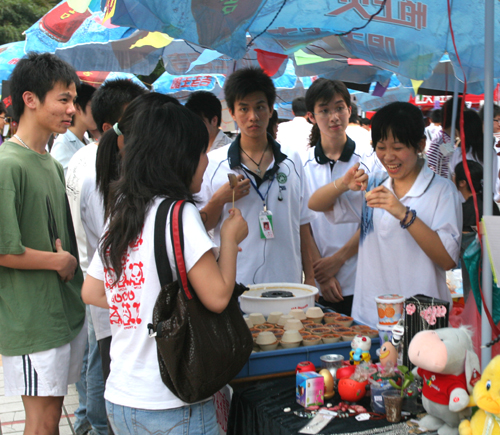 据“市场”管理人员介绍,市场购销两旺,交易秩序井然。记者现场看到,“老板们”亲手制作的牛肉丸子、豆腐花、烤羊肉串和工艺品很受同学们欢迎。