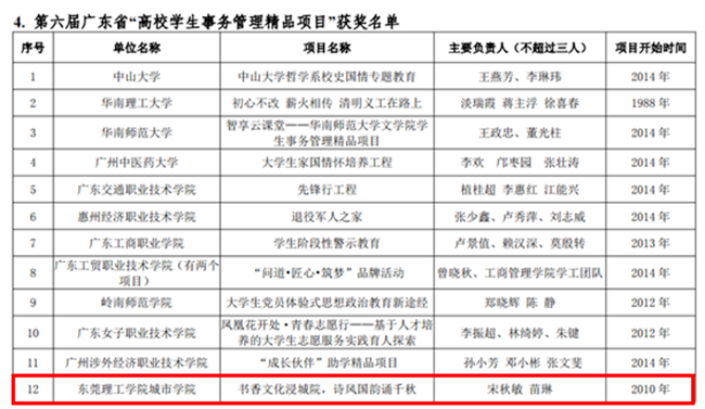 近日,广东省高校学生工作专业委员会公布了2017年学生工作先进个人、优秀团队、第九届学生工作“红棉奖”、第六届“高校学生事务管理精品项目”等奖项获奖名单。我院商学院李玉春荣获“2017年度广东省高校学生工作先进个人”,商学院学工团队荣获“2017年度广东省高校学生工作优秀团队”,宋秋敏、苗琳的“书香文化浸城院,师风国韵诵千秋”项目荣获第六届广东省“高校学生事务管理精品项目”。
