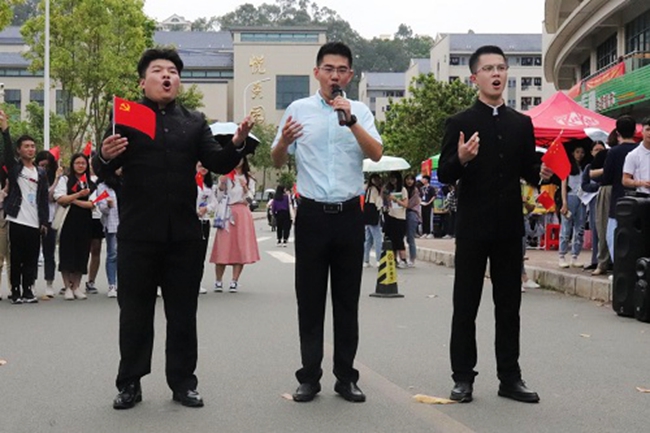 当朱晟老师唱起“我和我的祖国,一刻也不能分割……”时,慷慨激昂的旋律点燃了在场所有学子的爱国热情。同学们纷纷驻足,自发地跟着旋律,加入到合唱的队伍中。师生们用热情激昂的歌声、青春洋溢的舞蹈,抒发了对党和祖国的热爱,为庆祝新中国成立70周年献上最真挚的祝福。