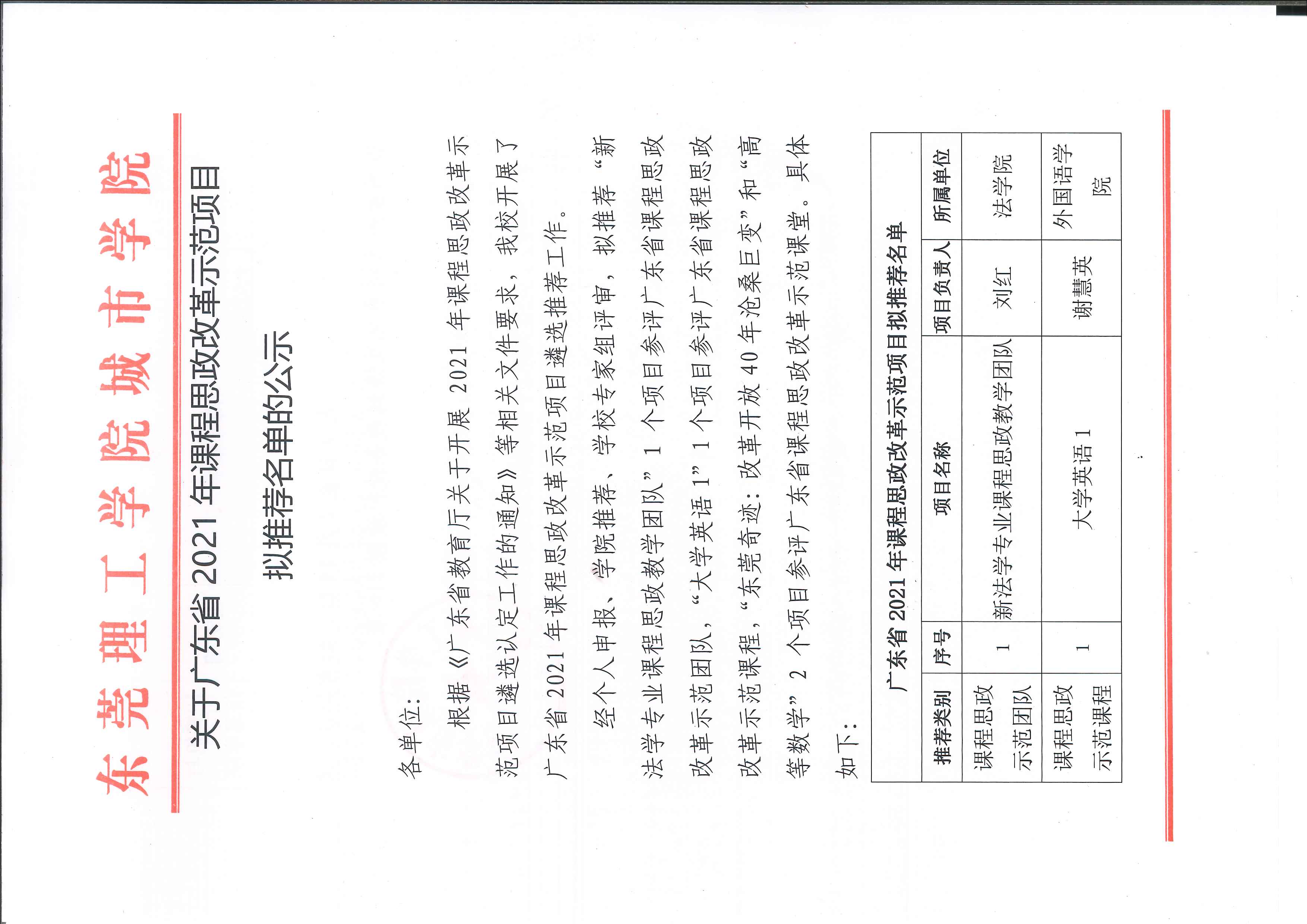 东莞理工学院城市学院关于广东省2021年课程思政改革示范项目拟推荐名单的公示